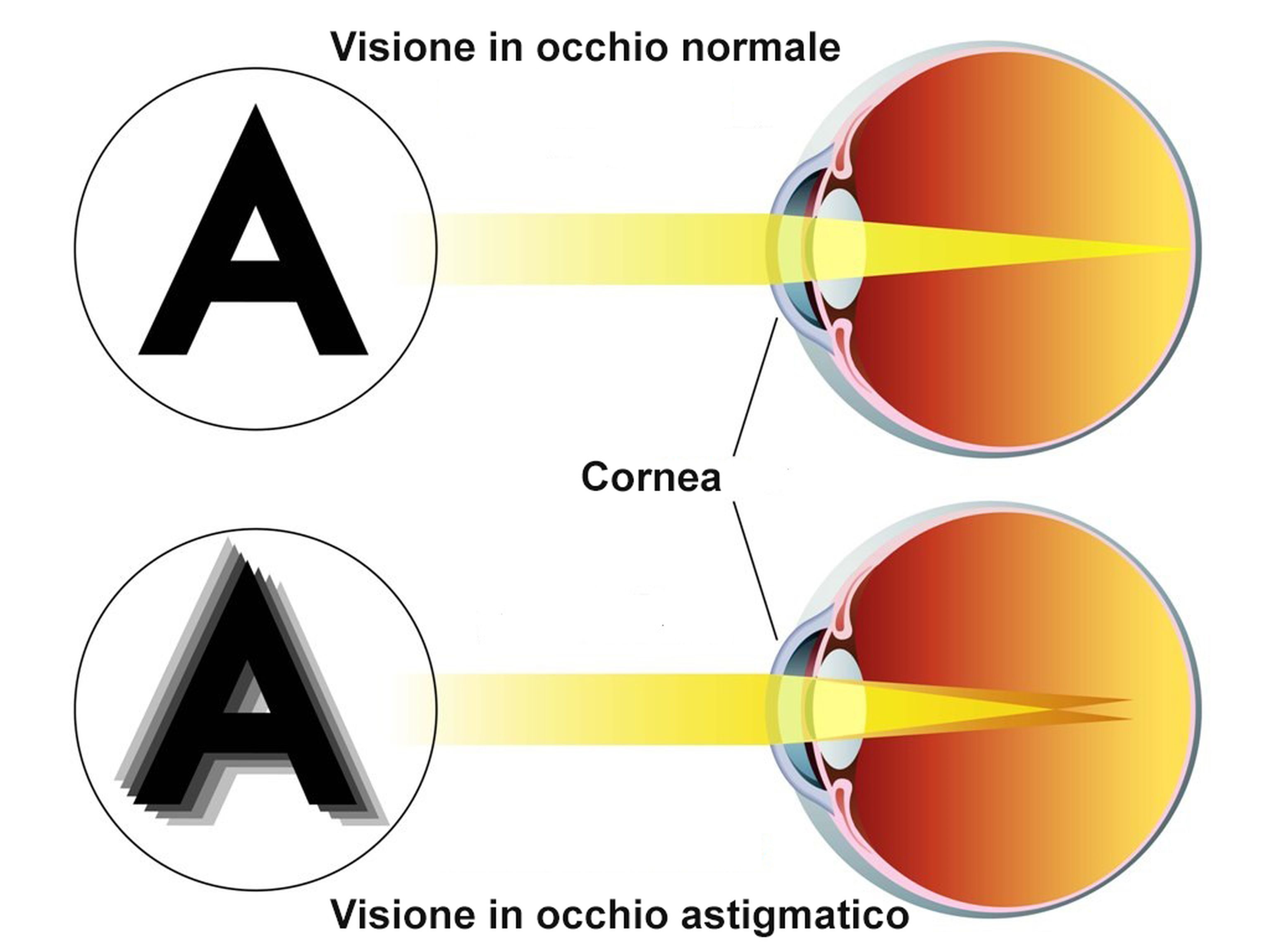 Quando un occhio è privo di difetti di refrazione si definisce emmetrope e vede perfettamente da lontano e vicino senza la necessità di occhiali o lenti a contatto. Tale condizione regredisce fisiologicamente con l’invecchiamento, rendendo via via più difficoltosa la visione da vicino una volta superati i 45 anni, con l’instaurarsi della presbiopia. L’astigmatismo, insieme con la miopia e l’ipermetropia, è pertanto un errore di refrazione, ossia una condizione ottica in cui le immagini non vengono correttamente focalizzate sulla retina. Esso è un difetto provocato dalla geometria della cornea, che presenta una forma ovoidale invece che sferica (FIGURA 1): tale tipo di curvatura non permette la messa a fuoco delle immagini sulla retina in un solo punto, ma su piani diversi. Comporta pertanto una cattiva visione sia da vicino sia da lontano, creando tipicamente aloni allungati intorno alle luci. L’astigmatismo non presenta la progressione tipica della miopia, poiché è una condizione corneale statica che normalmente rimane sempre della medesima entità con il passare degli anni. L’utilizzo di occhiali o lenti a contatto è fondamentale per fornire una buona visione e prevenire fenomeni di astenopia (affaticamento visivo) tipici di attività che richiedono concentrazione prolungata, quali la guida e la lettura. Poiché l’astigmatismo è una condizione di alterata curvatura corneale, può presentarsi molto frequentemente associato anche ad altre condizioni tra cui miopia (occhio più lungo della norma) ed ipermetropia (occhio più corto della norma). Nel primo caso sarà presente un astigmatismo miopico, mentre nel secondo un astigmatismo ipermetropico, che può provocare arrossamento e bruciore oculare e palpebrale, eventualmente associato a cefalea. Schematicamente, esistono 3 grandi categorie: l’astigmatismo secondo regola, il più frequente, caratterizzato da una maggiore curvatura del meridiano corneale verticale; l’astigmatismo contro regola, caratterizzato da una maggiore curvatura del meridiano orizzontale e da una qualità visiva peggiore del primo; l’astigmatismo obliquo, che è una via di mezzo tra i due. La maggior parte della popolazione presenta un debolissimo difetto astigmatico (0.25 diottrie), perlopiù secondo regola, che risulta pertanto bene tollerato dal paziente anche senza la necessità di occhiali. Tuttavia, quando questo valore cresce, è necessaria una adeguata correzione con occhiali per una visione ottimale e priva dei sintomi sopra descritti.